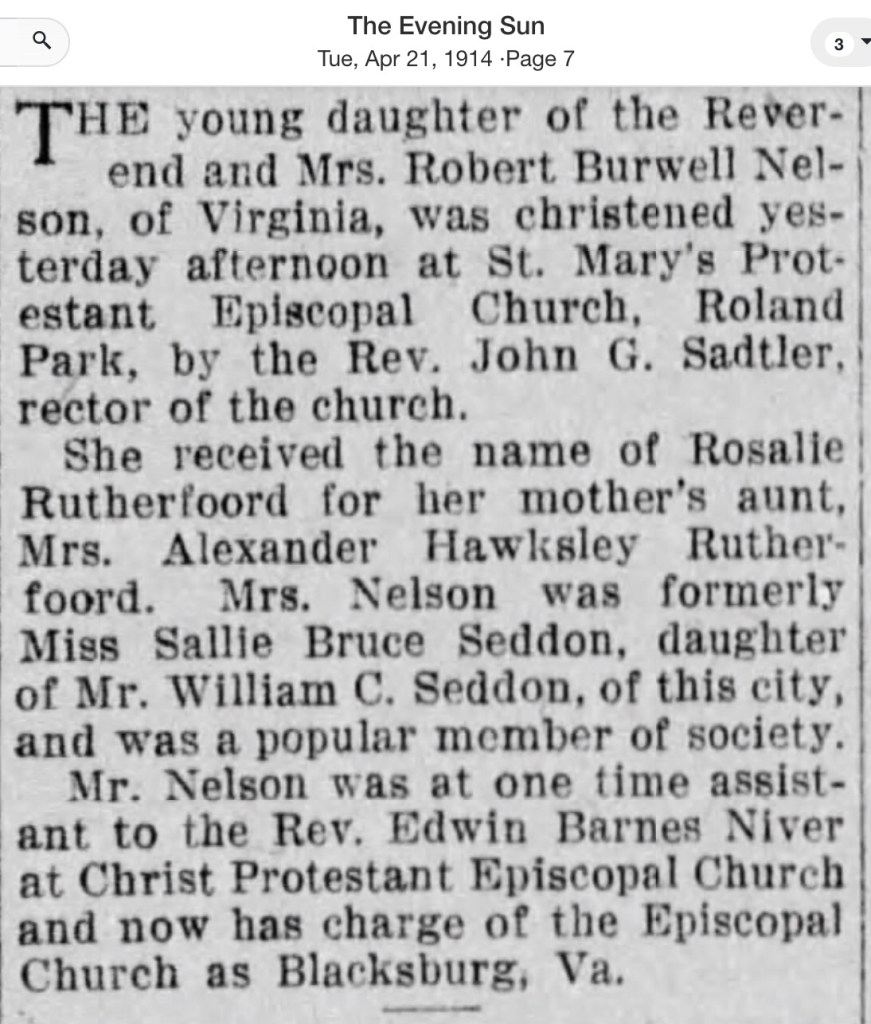 She received the name of Rosalie Rutherfoord for her mother’s aunt, Mrs. Alexander Hawksley Rutherfoord. Mrs. Nelson was formerly Miss Sallie Bruce Sedona, the daughter of Mr. William C. Sedona, of this city, and was a popular member of society.