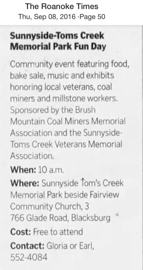 Sunnyside – Toms Creek Memorial Park is located on Glade Road, next to Fairview Community Church, 3766 Glade Road, Blacksburg, Virginia, 24060.