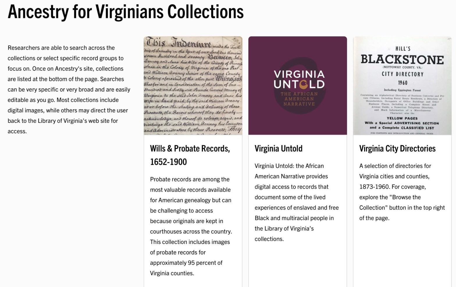 Explore the free digital holdings of the Library of Virginia. These rich collections of primary sources are invaluable for researching family history and for uncovering the stories that shape our shared past.