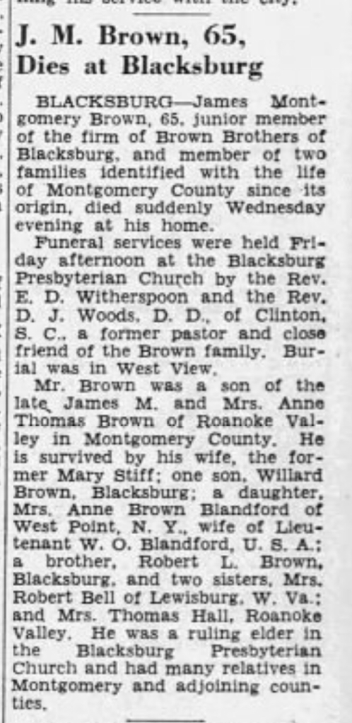 The 1955 Blacksburg telephone directory listed him as “Brown, J. Willard r Main N.” His phone number was 2161, the same phone number of his parents in 1938/39 which possibly means he is living in the same home or did phone numbers move with the person at this time? The Brown Bros business was not listed in the 1955 directory.