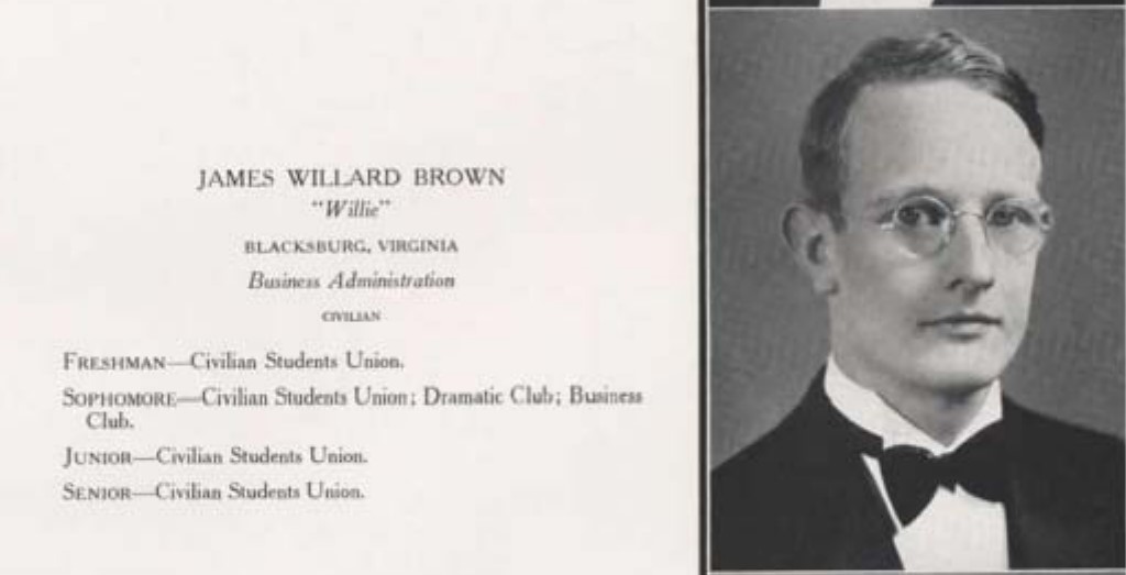 James Willard Brown graduated from VPI on June 6, 1938 with a degree in Business Administration (Times Dispatch, Richmond, 29 May 1938). One year later he signed his draft card at age 23. His mother, Mary S. Brown, was listed as the contact. Willard’s employer was noted as Brown Bros., Blacksburg. The 1938 and 1939 telephone directories list “Brown Bros Gen MDSE Main” St, Blacksburg, phone 3351 and the home address for James M. Brown was Kent St, phone number 2161.