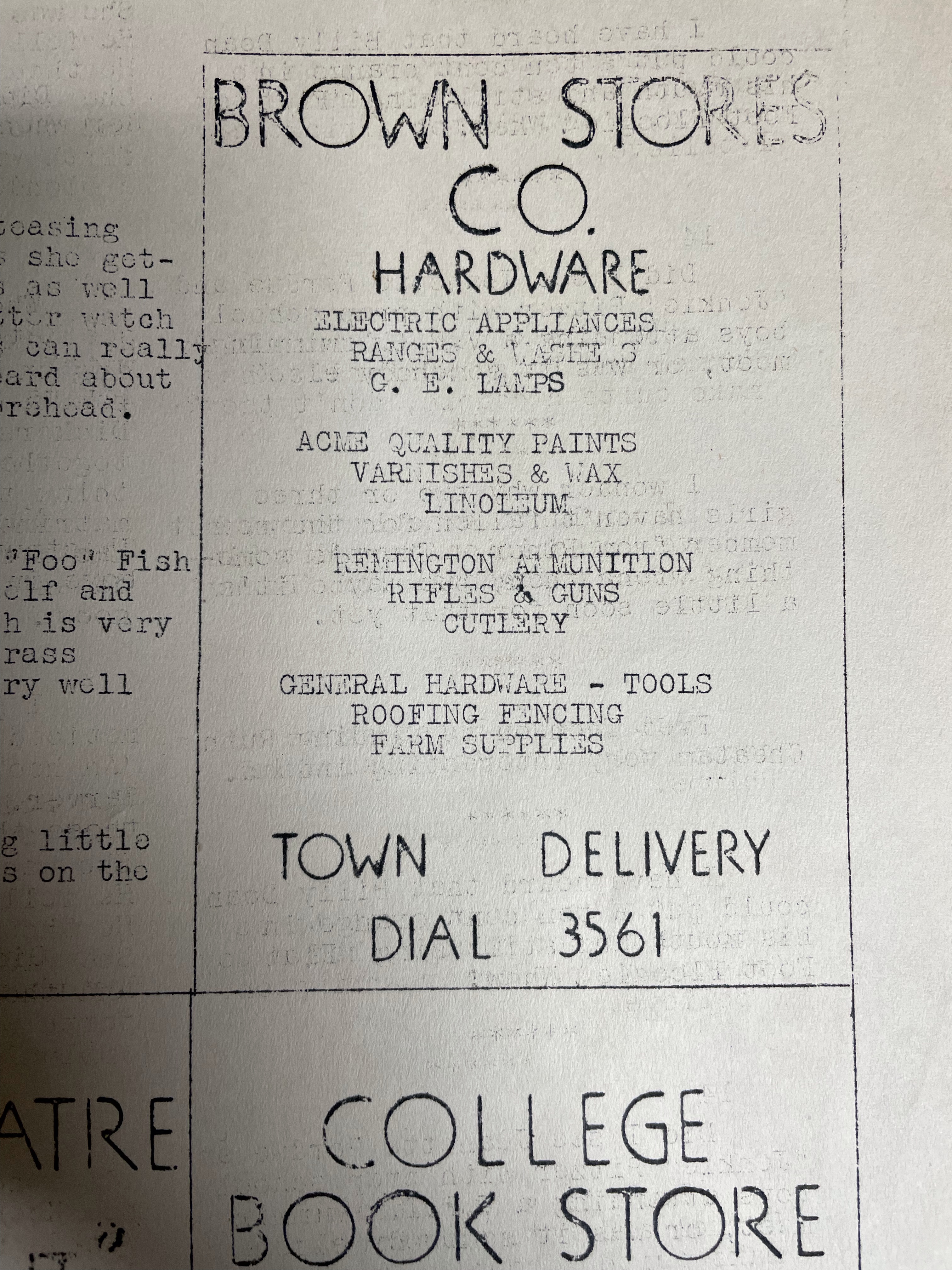 Brown Stores Co, Hardware store was located on Main and College Ave. The advertisement is in the March 1939 Tattle Tale, the Blacksburg High School’s monthly student publication. (Courtesy of the Blacksburg Museum and Art Foundation)