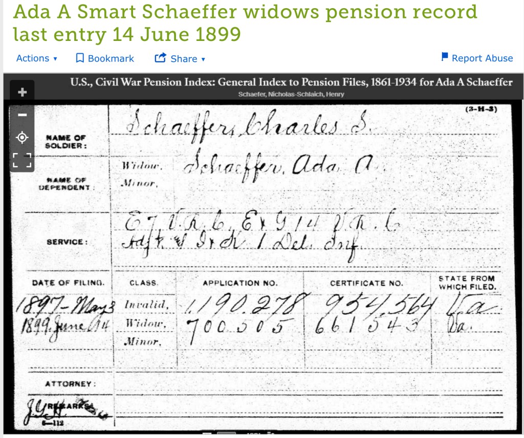 Charles (Charlie”) Stoever Schaeffer was born in Germantown, Pennsylvania, on 16 November 1830 to John and Sarah Stoever Schaeffer. He and Ada (Addie) August Smart (1837-1921) married 28 November 1872 in Germantown. By May 1897 Charles filed as an invalid to collect a US Civil War Pension. He died on 5 May 1899 in Pennsylvania after several operations, living to be 69 years old. He was buried in Ivy Hill Cemetery, Philadelphia, Pa.