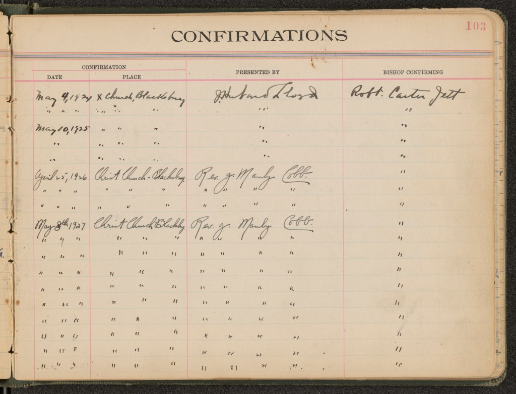 On August 23, 1931, at a special service conducted by the rector and Mr. Cobb, the previous rector, the wafer box was dedicated as was also the organ and other articles not previously dedicated, the font, the pulpit & lectern in memory of Mrs. Elizabeth Amiss Palmer. The organ chamber in memory of Mrs. & Col. William H. Palmer, and the ewer in memory of Maria Lawson Bolton.