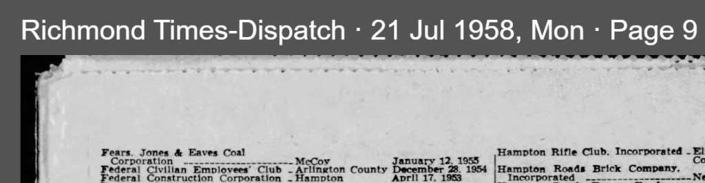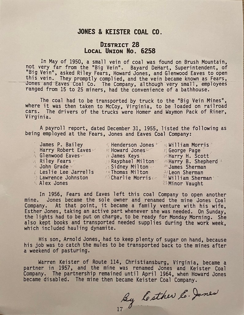 Two African American owned coal operations were located near Wake Forest. We have not learned much about the Sherman operation, but much is known about the the Fears, Jones & Eaves Company. It was started by Riley Fears (1898-1967), Howard H Jones (1915-1983) and Glenwood Eaves (1912-1997), in operation by the early 1950 and registered with the Virginia Corporation Commission by 1958. According to an interview with Esther “Queen” Eaves Jones (LaLone, 1997), Howard H. Jones (husband), Riley Fears (uncle) and Glenwood Eaves (brother) jointly operated the mine but in 1956 her husband ran the operation alone, moving to another seam location (vein). Between 1957 to 1964 he and Warren Keister (white) operated the mine as partners. When Howard H. Jones’ health declined, Warren Keister continued to run the operation. This mine was located up the mountain from Howard and Esther Eaves Jones’ home in the Wake Forest community (map). According to Mrs. Jones, the mine was over 1,800 ft deep, employed a 12-20 men (Black and White) and a couple of mules. Because the mine was not served by rail, the coal had to be trucked down the mountain. In 2008 the office of Abandoned Mines sealed the 7 entrances for safety and stabilized the refuse (gob) piles.
