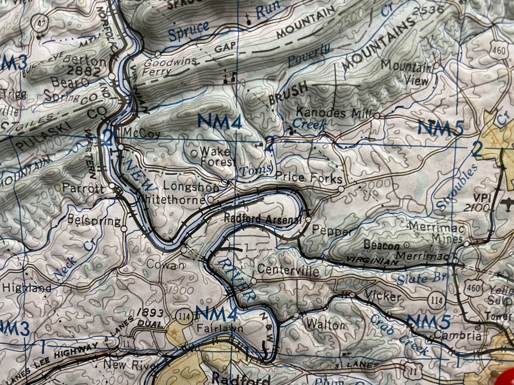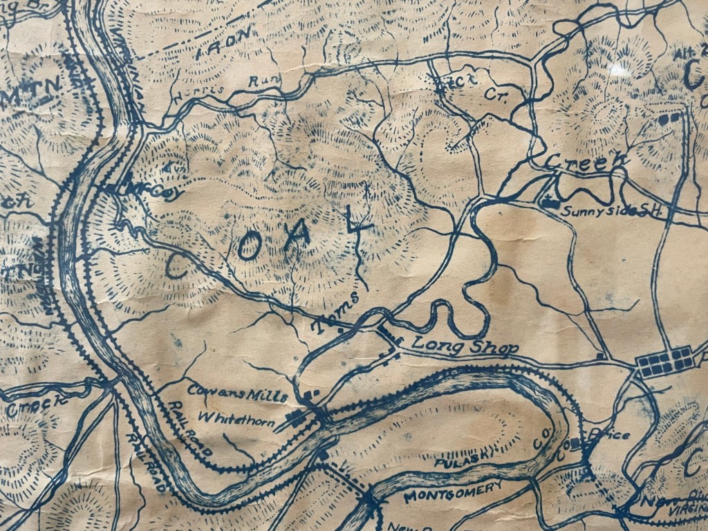 This is the 1925 version of the Montgomery County Map produced by W.F. Wall, Engineer. Note Cowans Mill and Whitethorn on the north side of the New River (red circle). A road is located on both sides of the river. This is the location where the boatmen would transport people, animals, & goods across the river. The the Virginian line train stop was at Whitethorn and Norfolk Western line stop was on the south bank of the river.
