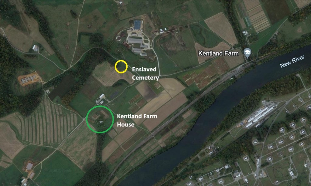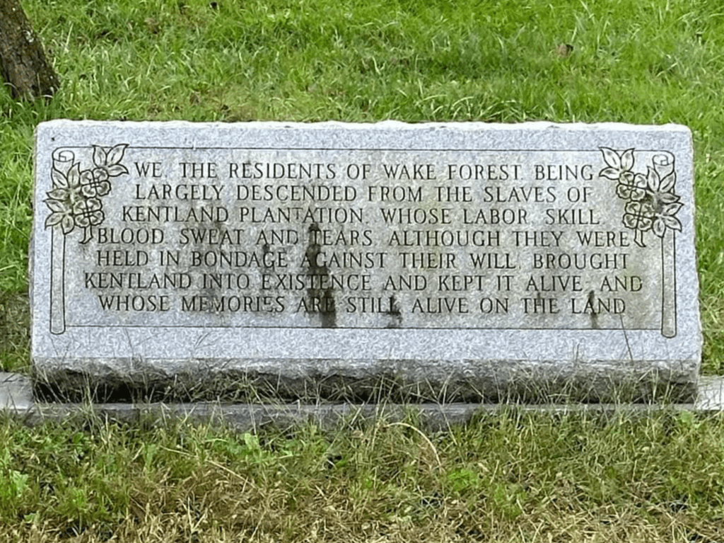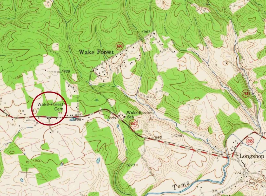 Wake Forest Cemetery is located east of the Wake Forest and Big Vein Roads as circled on the map. Many of the local family members are buried here. The Kentland enslaved people are buried east of the family plot. A modern day marker commemorates this cemetery, no individual markers exist.