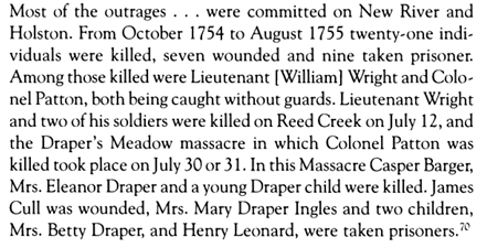 However, as Shawnee attacks intensified, most of these families, except Adam Harmon, abandoned their claims. Their failure to pay quitrents to James Patton’s estate – Colonel Patton died at Draper Meadow in 1755 – resulted in forfeiture. John Buchanan then took possession of the Price and Harless lands. In 1757, these families sued Buchanan but lost, allowing him to retain ownership of the Big Horse Shoe and the land along Toms Creek.