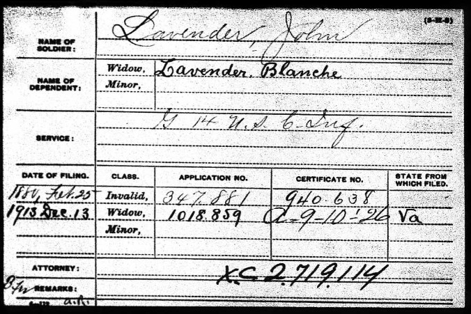 On 25 Feb 1880 an application was filed indicating he was certified for invalid status, no state was listed. Then on 13 December 1913 an application was filed to designate Blanche as a widow in the state of Virginia.