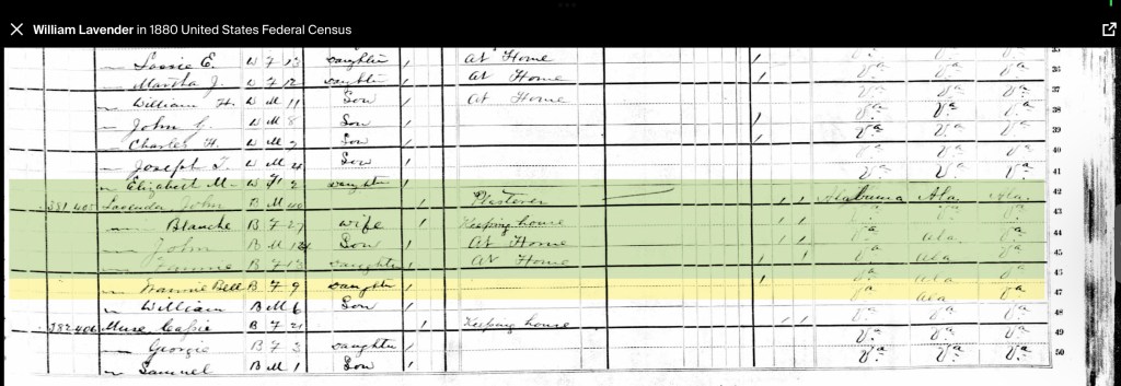 Throughout the primary source document searches we noted discrepancies in ages, places of birth, and death of spouses. John was listed as born in Georgia, Alabama, Tennessee or Virginia in different documents. Also, the ages vary until the early 1900’s.