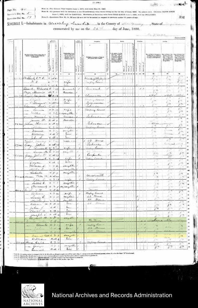 It is not know if Rachel, Blanche or John were born into slavery, but at this point of our search that is a logical assumption. According to the 1880 census Blanche Twigg/Trigg was born about 1852-54 and John (plasterer) about 1838-40.