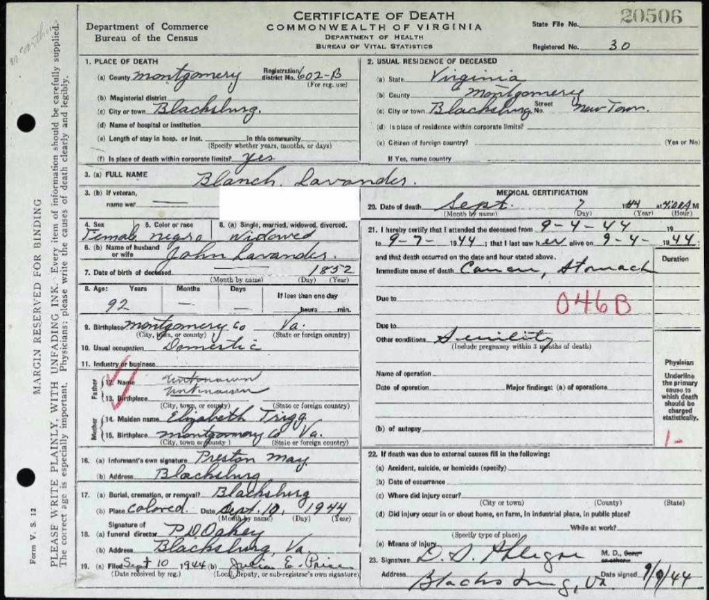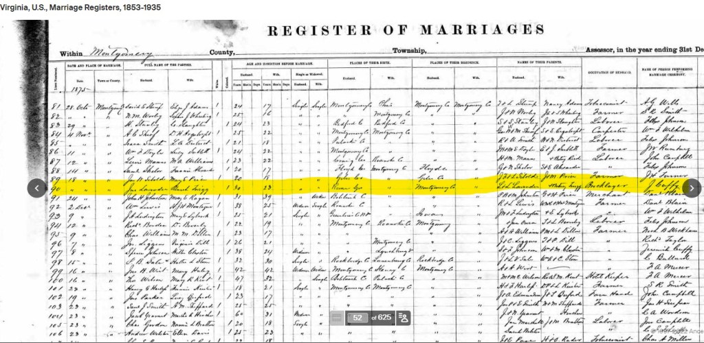 John Lavender and Blanch Twigg [Trigg] married on the 18th day of November, 1875 in Montgomery County. J[erimiah] Cuffy married the couple at the Rome[?] Grocers, this was noted as the first marriage for both. John, a bricklayer, was about 30 years old and Blanch was 23. The marriage register notes that his parents were Lewis & Lucy Lavender and Blanch’s mother was Betsey Twigg.