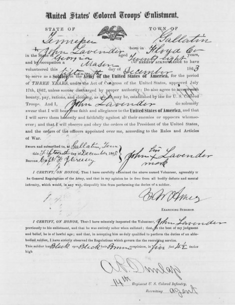 Citation: “United States Civil War Service Records of Union Colored Troops, 1863-1865,” database, FamilySearch (https://familysearch.org/ark:/61903/1:1:JZDQ-JVX : 12 December 2014), John Lavender, 1863; from “Civil War Soldiers – Union – Colored Troops,” database, Fold3.com (http://www.fold3.com : n.d.); citing military unit 14th US Colored Infantry, NARA microfilm publication M1822, National Archives and Records Administration, Washington, D.C., roll 9.