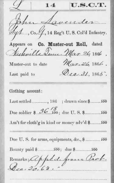 On March 26, 1865 Sargent John Lavender of Company G, 14th Regiment of the U.S. Colored Infantry was mustered-out of service in Nashville, Tennessee.