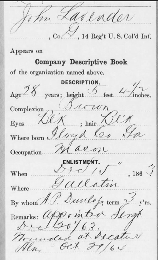 We found a copy of the Civil War Pension Index listing John Lavender and Blanche Lavender, he served in the G Company, 14th US Colored Infantry from 1863 to 1865. His 28 page service record reveals that he enlisted for three years in Gallatin, Tennessee on 15 December 1863 and was appointed sergeant. He was 28 years born 1835 in this document (his birth year varies with each document). He was 5′ 4 1/2″ tall, of brown completion with black eyes and hair. He was born in Floyd Co, GA (Alabama in other documents) and occupation is mason. He was wounded in action at Decatur, AL on 29 October 1864.