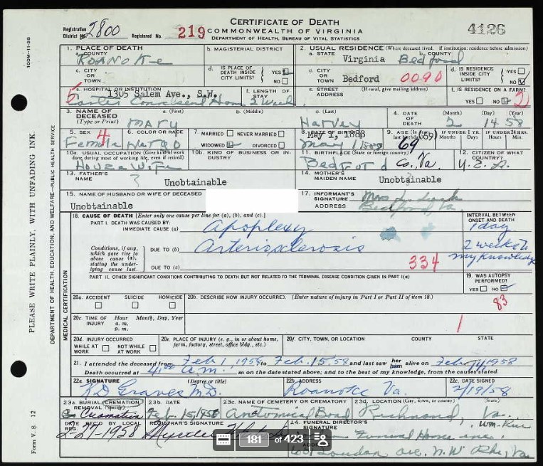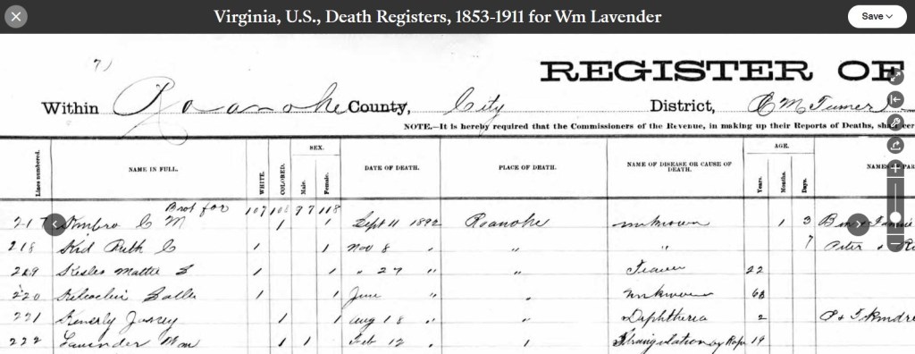 Register of Death, Roanoke City -Last line reads: Will Lavender; Colored; Male; Date of Death, Feb 12, 1892; Place of Death, Roanoke; Cause of Death, Strangulation by Rope; Age, 19.