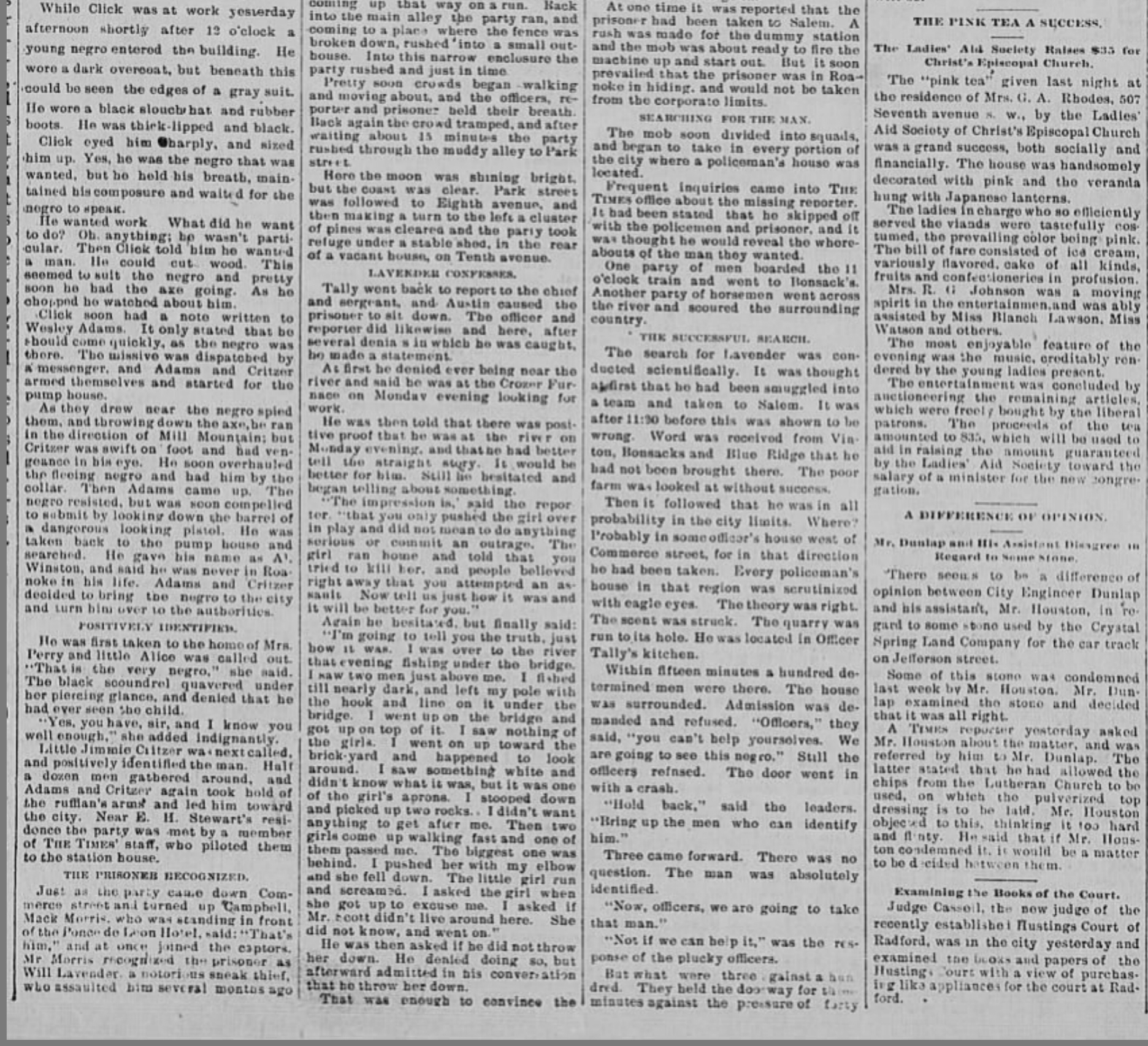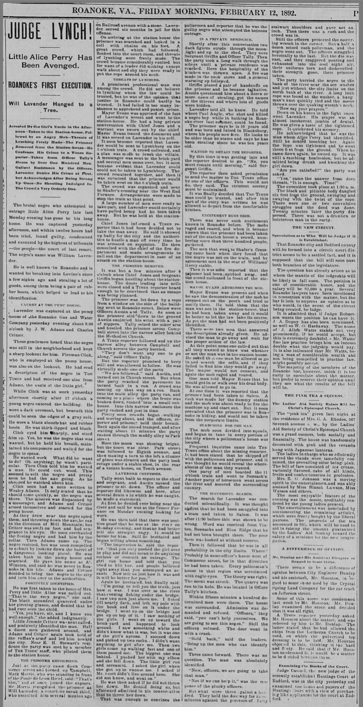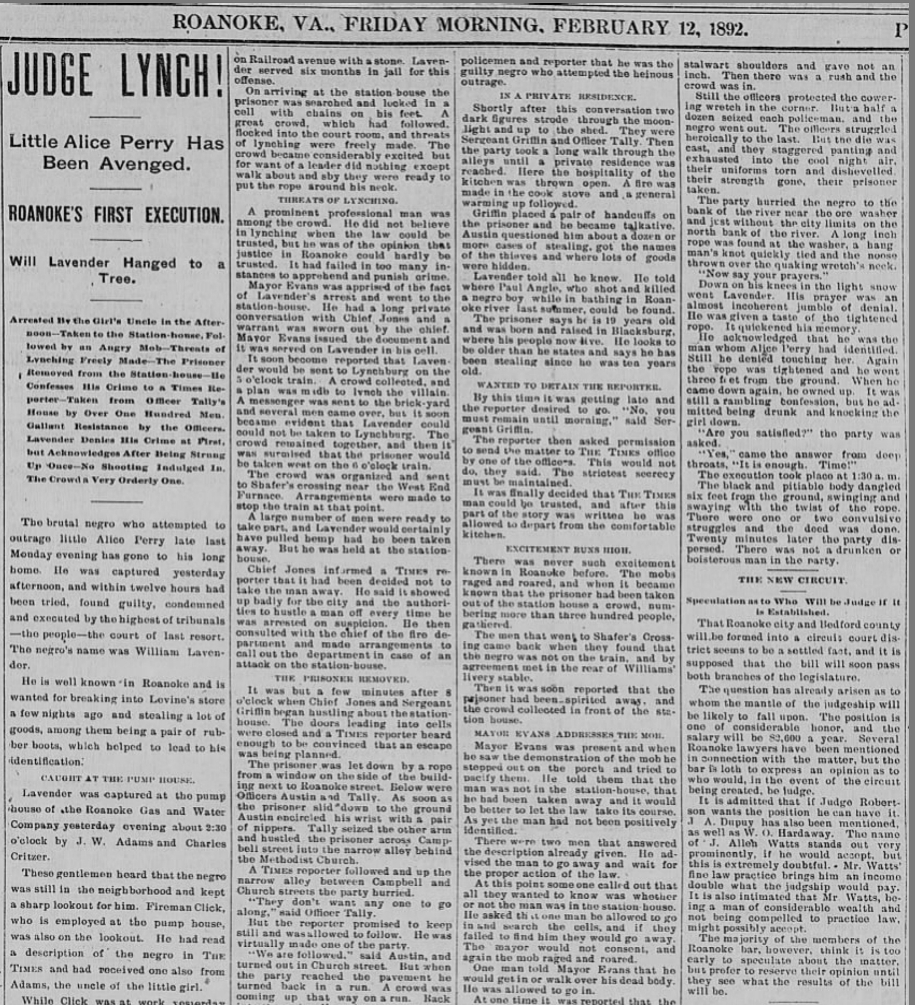 A Roanoke Times article dated Friday Morning, 12 February 1892 is titled “Judge Lynch! Little Alice Perry Has Been Avenged. Roanoke’s First Execution. Will Lavender Hanged to a Tree.” The article notes that Will Lavender, an African American man of 19 years of age, was born (1874) and raised in Blacksburg, Virginia. We are searching for information about Will and his family as well as their ties with historic New Town in Blacksburg. The information on this page will be disjointed until we learn more, so be patient. If you have information to add, please feel free to contact us, gathering.blacksburg.history@gmail.com.