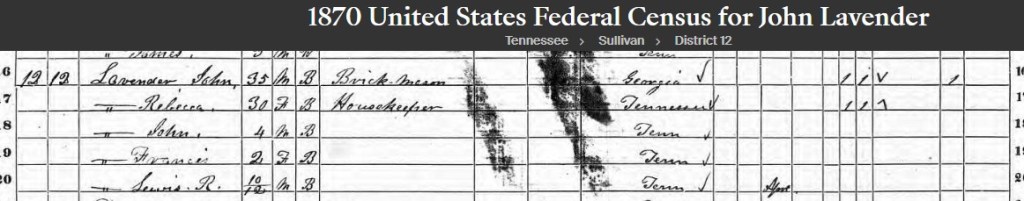 In the 1870 Census of Kingsport, Sullivan County, Tennessee, John Lavender (brick mason) is listed as the head of the household. Rebecca (keeping house) and then three children, John, Frances and Lewis R. follow. Unfortunately, the 1870 census does not specify relationships of the people within households, but from several marriage licenses and death certificates of John’s children, we are confident that Rebecca was the mother. Will was not listed because he was born four years after this census.