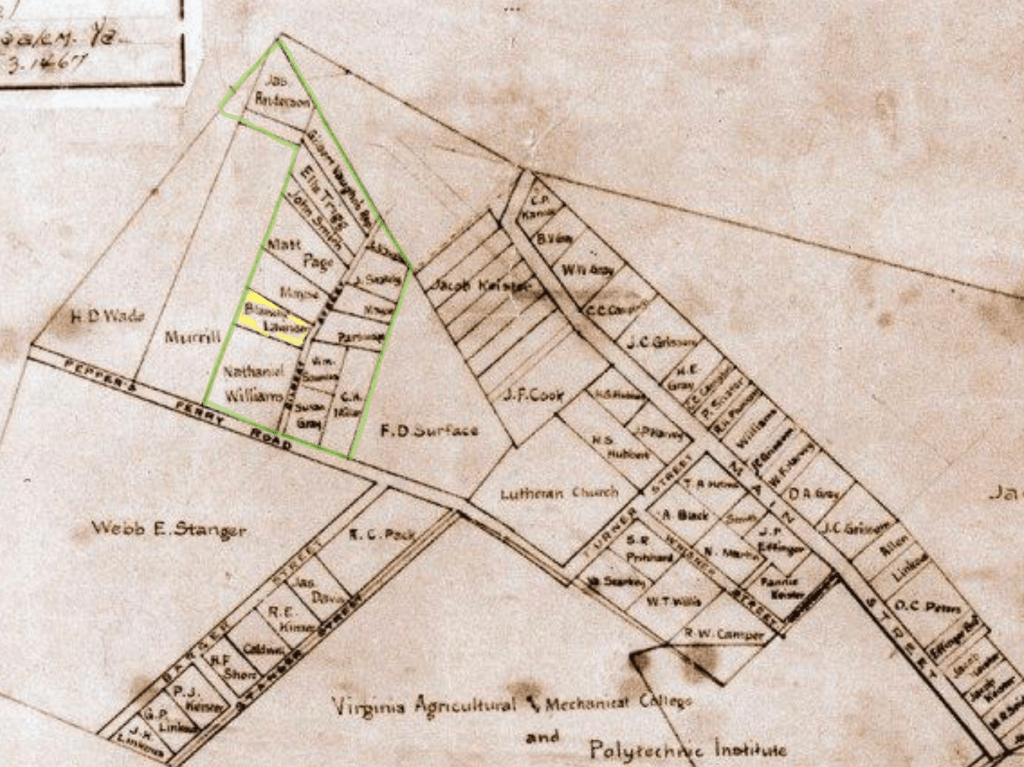 Blacksburg 1900 Town Map of New Town (Courtesy of the Blacksburg Museum and Cultural Center). Blanche’s property (yellow) was between Nathaniel Williams and Mayse [May]. New Town is outlines in green, though no official boundaries were used at the time. Note Ellie Trigg’s property, neighbor of Gilbert Vaughn.