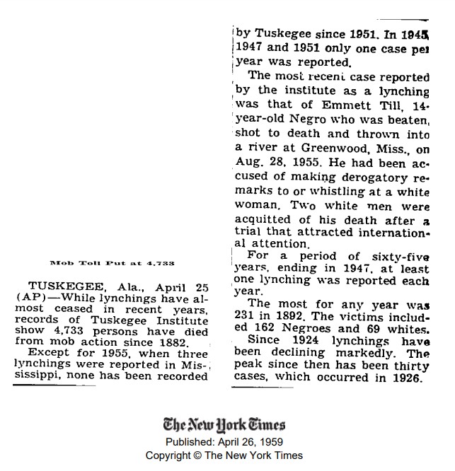 New York Times, 26 April 1959 article “Mob Toll Put at 4,733.