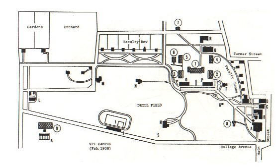 “The map shows the location of buildings on the Virginia Tech campus in February 1908. The shaded buildings, identified with circled numbers, still stand in some form on the campus. The solid black buildings, identified with capital letters, are gone. The area marked “Drill Field” was not called by that name until 1926.”