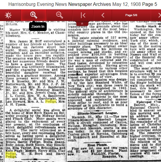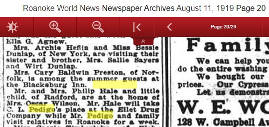 Charles (1872-1949) was the son of a “wagon maker,” Joseph Pedigo, who was listed in the 1870 Blacksburg census. Charles occupation was listed as “druggist” in the 1910 census. He was the druggist at the Ellett Drug Company at the corner of Main and College Ave, now Sharkey’s.