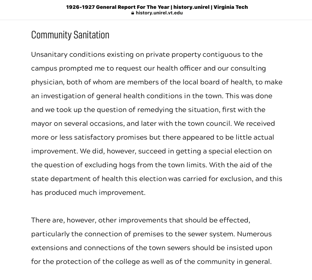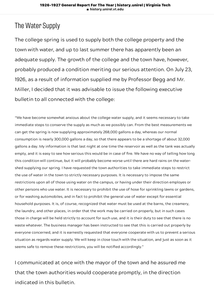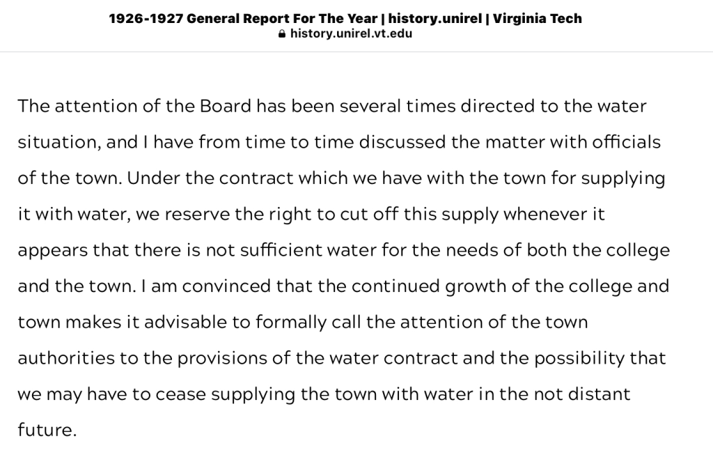 The whole report is interesting and illustrated how the town depended on the college for some basic services. The section on water and sewage are of interest. Dr J. Burruss mentioned a drought affecting the college’s spring output (bought from the Houston family in 1896). The water use by both the town and college outpaced spring replenishment capacity. This was a dire concern. The administration threaten to cut off the water supply to the town if the supply to meet the college’s need was not adequate. At that time the town depended on VPI for water after the 1911 typhoid outbreak.